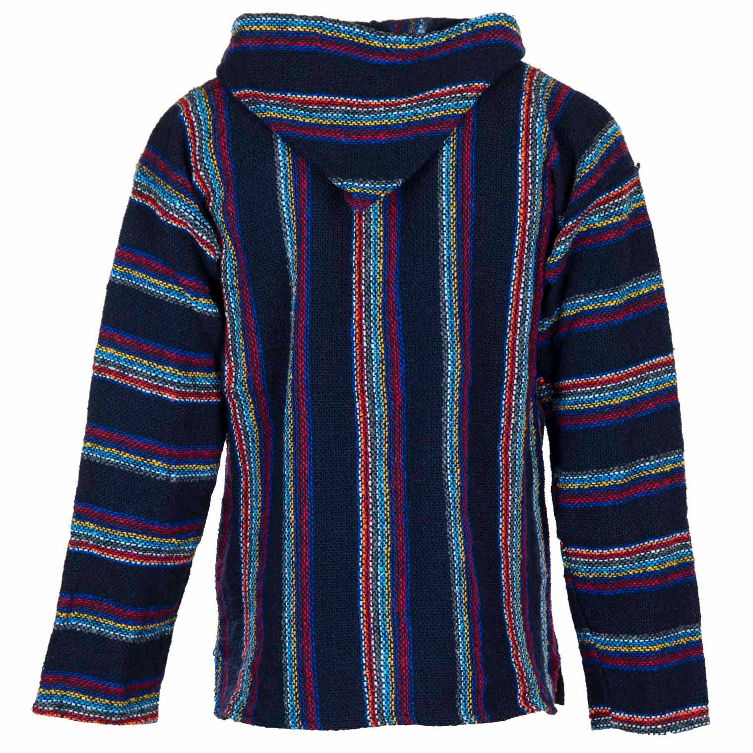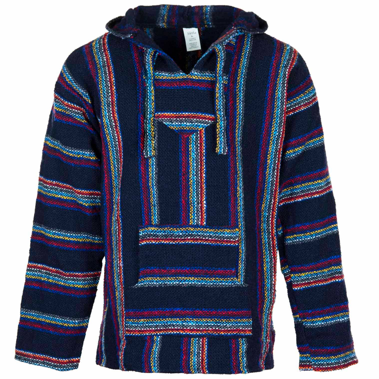 Our Mexican Baja tops are made using a cotton/acrylic yarn produced from recycled fabrics which makes them a great eco conscious choice. Popularised by 1970's North American surf culture, these relaxed hippy style classics have never gone out of fashion and are perfect for those cool summer nights in the festival field. With kangaroo pockets, a handy hood and a durable exterior with a soft, brushed interior; they are ever popular for outdoors activities.