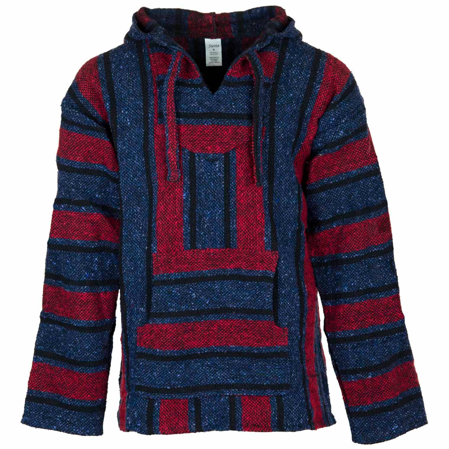 Our Mexican Baja tops are made using a cotton/acrylic yarn produced from recycled fabrics which makes them a great eco conscious choice. Popularised by 1970's North American surf culture, these relaxed hippy style classics have never gone out of fashion and are perfect for those cool summer nights in the festival field. With kangaroo pockets, a handy hood and a durable exterior with a soft, brushed interior; they are ever popular for outdoors activities.