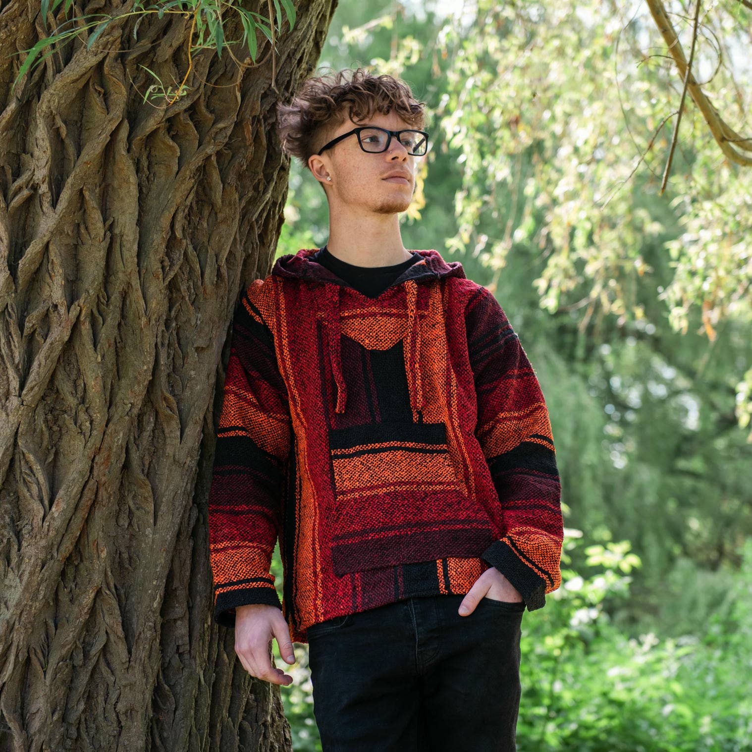 Our Mexican Baja tops are made using a cotton/acrylic yarn produced from recycled fabrics which makes them a great eco conscious choice. Popularised by 1970's North American surf culture, these relaxed hippy style classics have never gone out of fashion and are perfect for those cool summer nights in the festival field. With kangaroo pockets, a handy hood and a durable exterior with a soft, brushed interior; they are ever popular for outdoors activities.