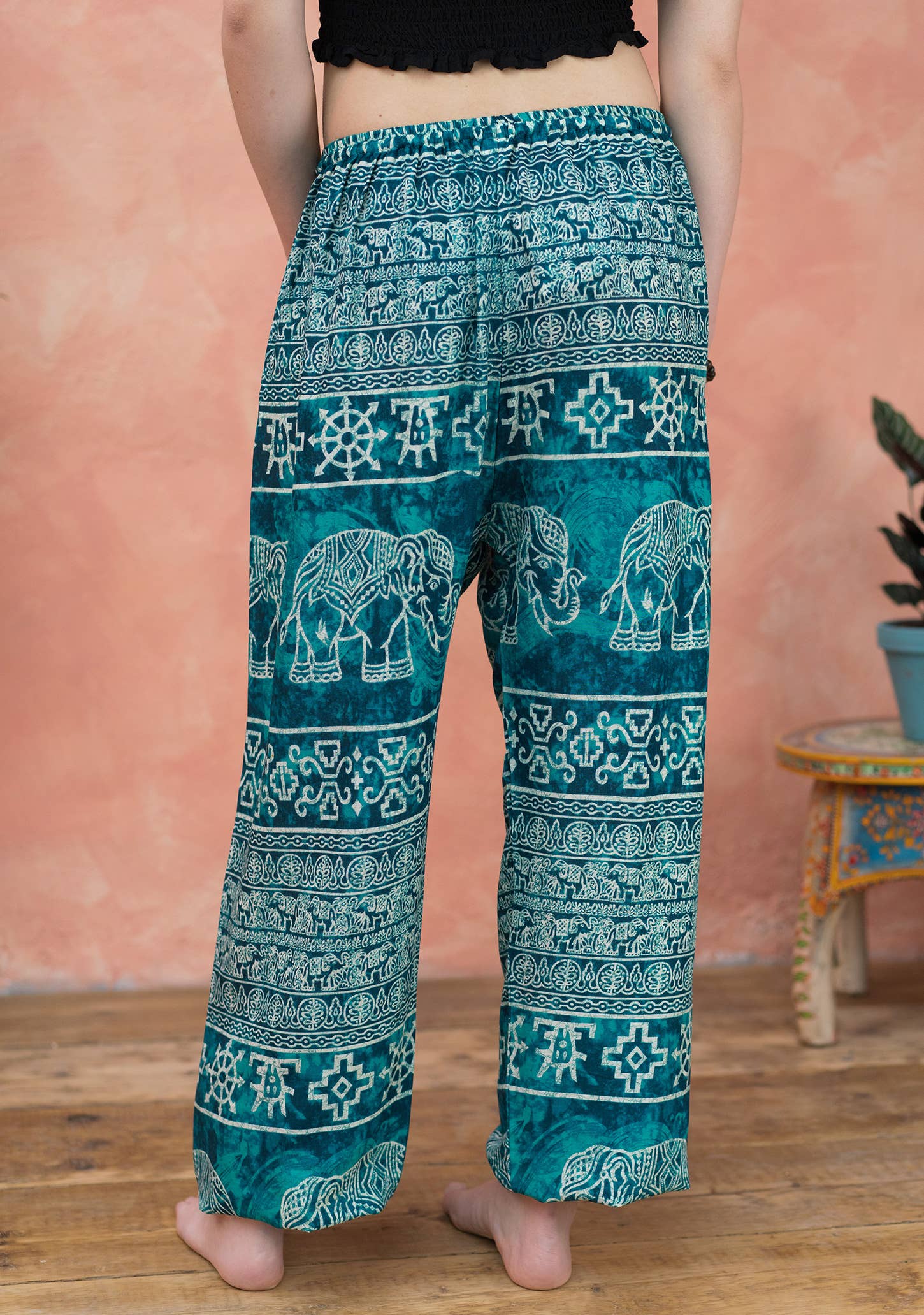 Colour choices of sea green, red, navy and black in horizontal patterns of elephants and geometry are achieved using the ancient method of mud dying, which is seldom used today. These unique, comfortable harem trousers in a trendy print have an elasticated waist with a white plaited pull cord. Elasticated and gathered at the ankles with a useful side pocket, the soft, lightweight fabric provides free movement and maximum comfort. Versatile and quick drying, they are ideal for festivals, leisure, beach holidays, travel, yoga, pilates, nightwear or loungewear. 100% Rayon Dry clean or hand wash in cool water using a gentle, pH-neutral or mild alkaline detergent. Rinse in cool water and avoid wringing. Hang to dry. Do not tumble dry. Cool iron on reverse.