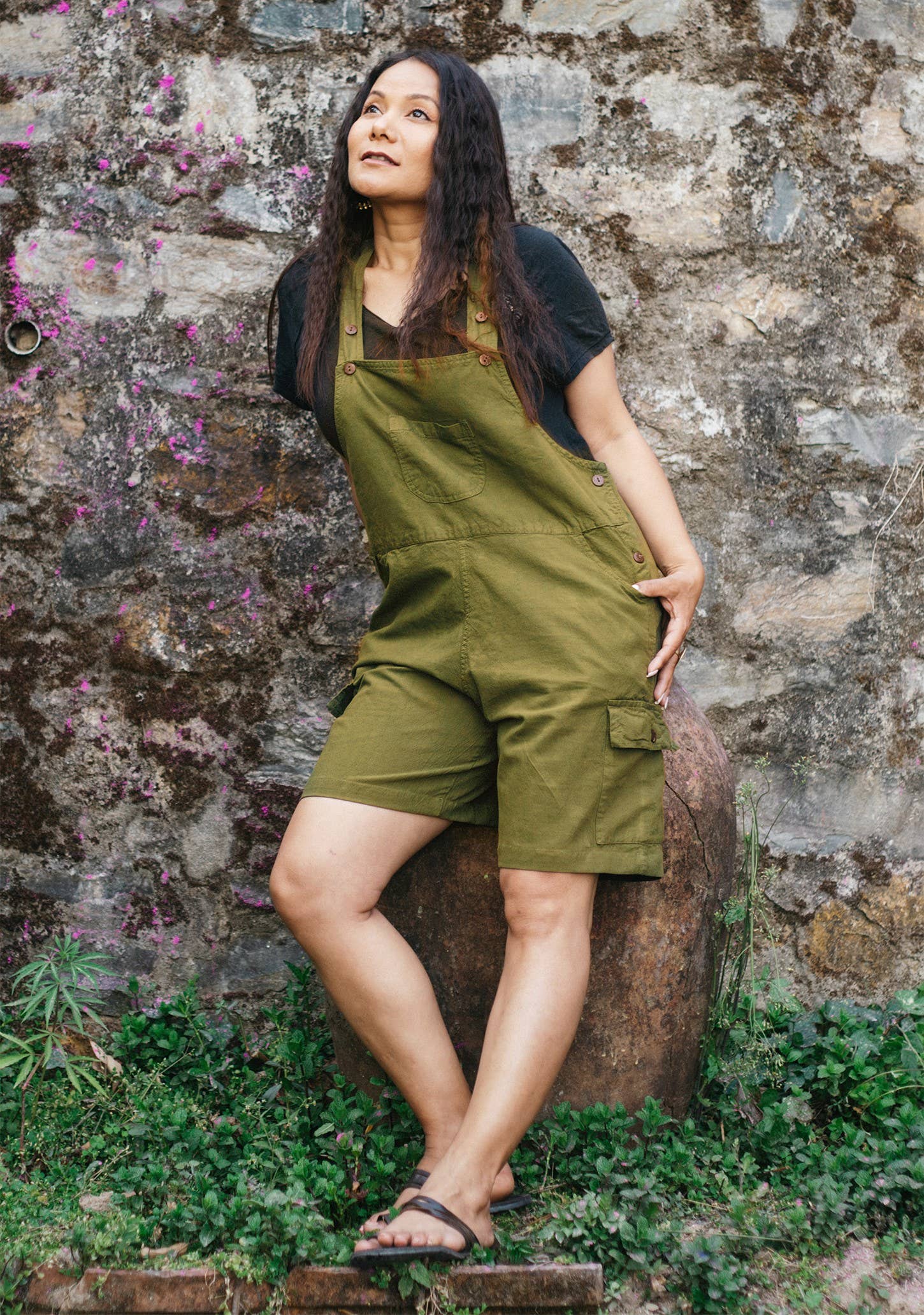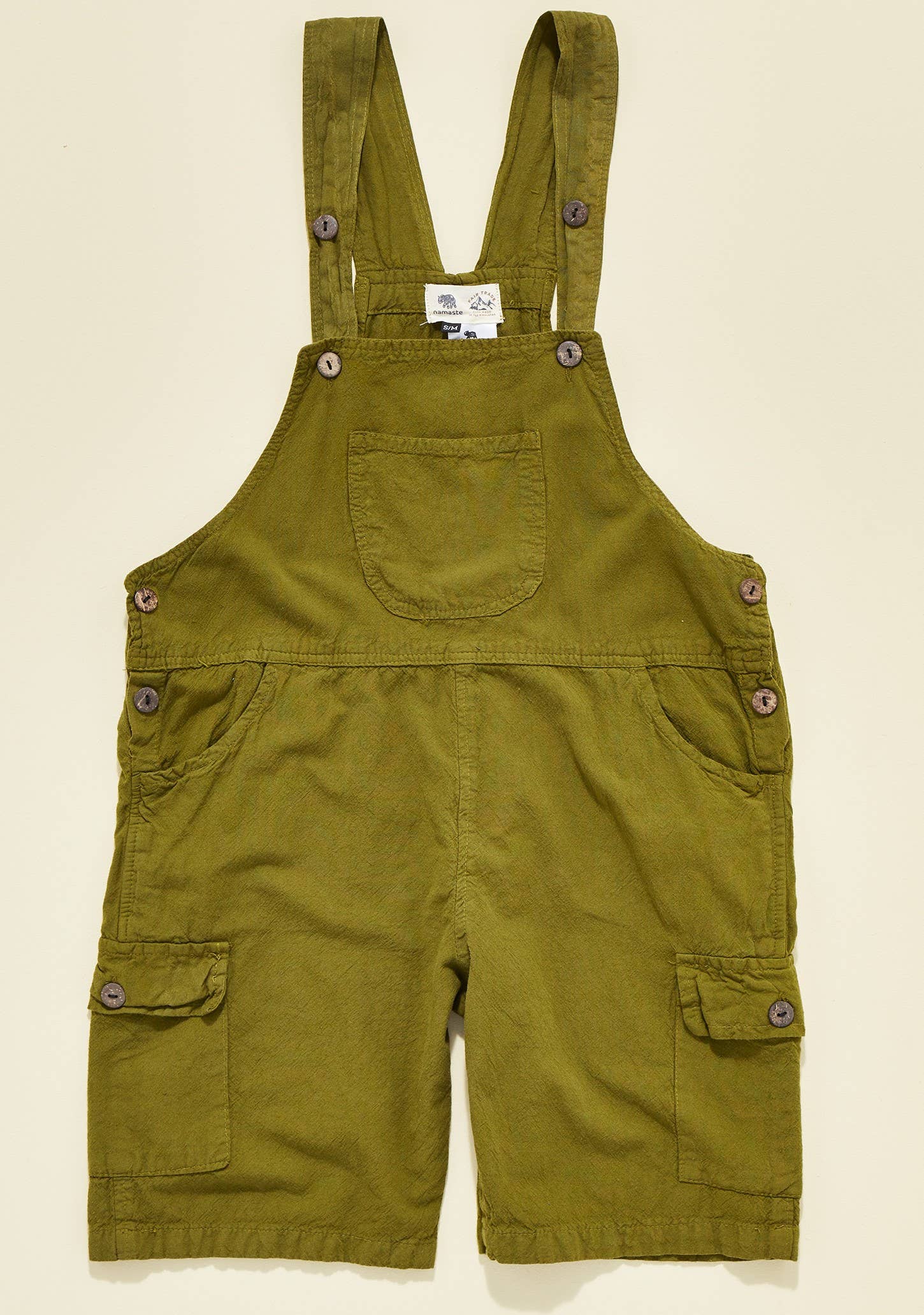 Classic 100% cotton dungaree shorts in army green, black or petrol blue stonewashed fabric. Features button secured shoulder straps, side button closures, button flap cargo pockets, bib patch pocket and loose fit hemlines. The buttons are made from locally and sustainably sourced coconut wood. These fashion favourites combine practical style and comfort. Team up with a simple t-shirt for a timeless on-trend look.