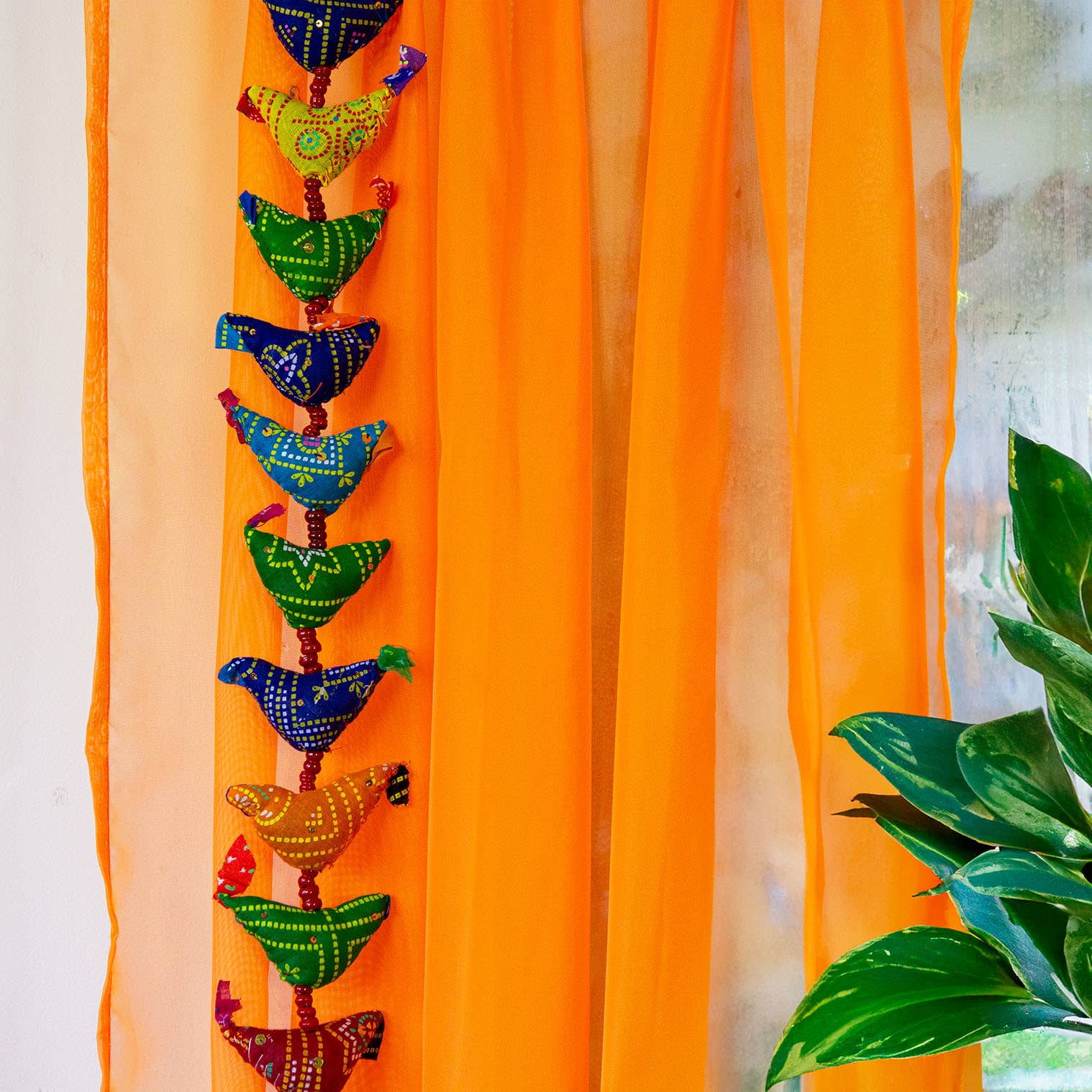 A string of colourful rustic fabric birds, decorated with a few well placed sequins and black glass beads, finished with a small cow bell for a little jingle. These fabric birds are made from recycled material and make a welcome addition to any living room.
